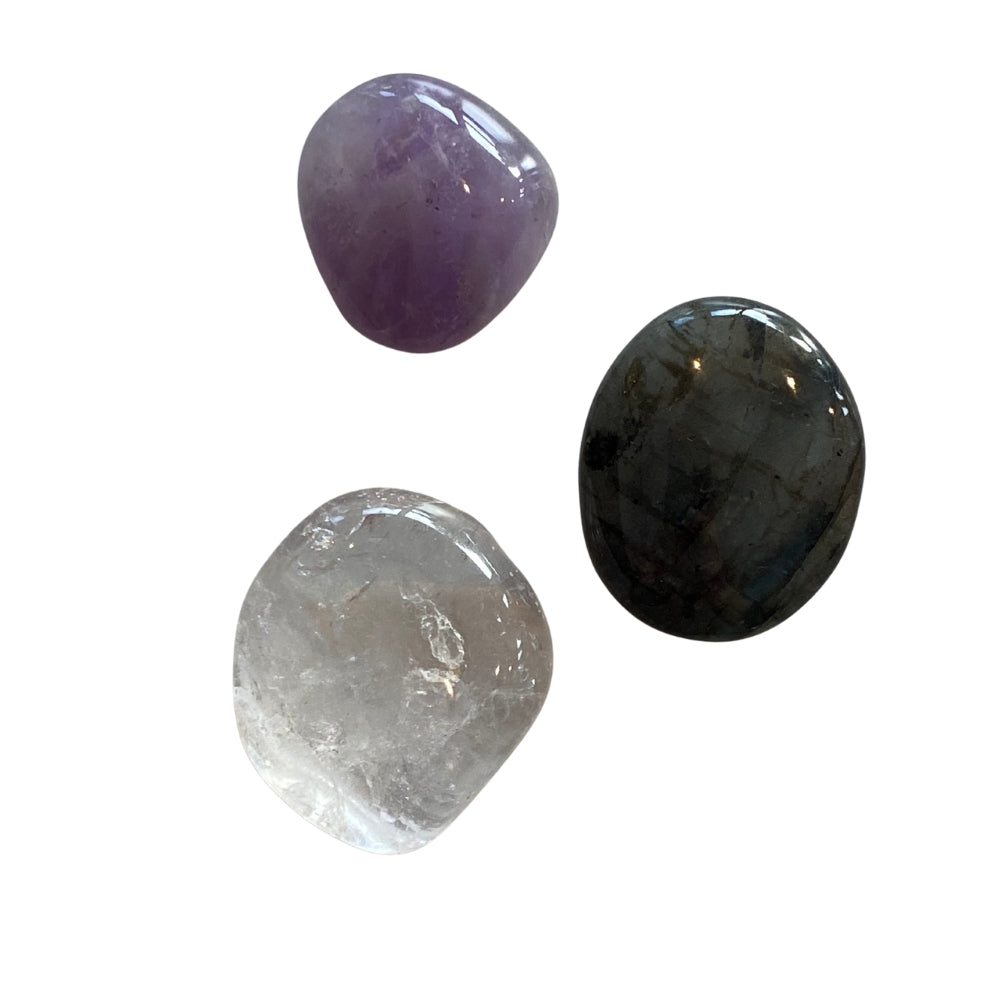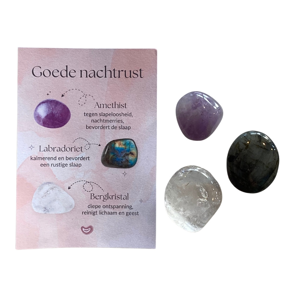 Pieker je je de slaap uit? Deze kalmerende edelstenen set is jouw natuurlijke ‘slaapmiddel’ zonder bijsluiter. Amethist zou kunnen helpen bij slapeloosheid en nare dromen, labradoriet staat bekend als kalmerend en bevordert volgens velen een diepe, rustige slaap en bergkristal zuivert je energie en bevordert ontspanning. Een fijne combinatie voor op je nachtkastje of onder je kussen – of om iemand te verrassen die wel wat meer Zzz kan gebruiken. Denk aan: een vriendin met jonge kids, een partner met druk hoofd of gewoon... jezelf.